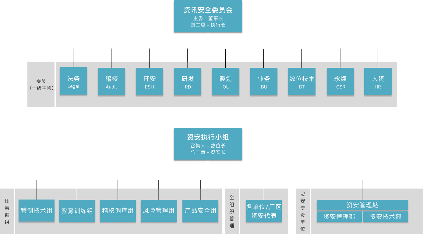 资讯安全委员会为世界杯官方网页版资安最高管理组织,向董事长报告。下辖资安执行小组负责推行资讯安全委员会之各项决议。为持续建构完整且精实的资安专 责团队,资讯安全管理处下成立「资讯安全管理部」与「资讯安全技术部」,持续投入资源以强化团队资安核心能力。